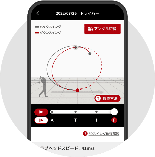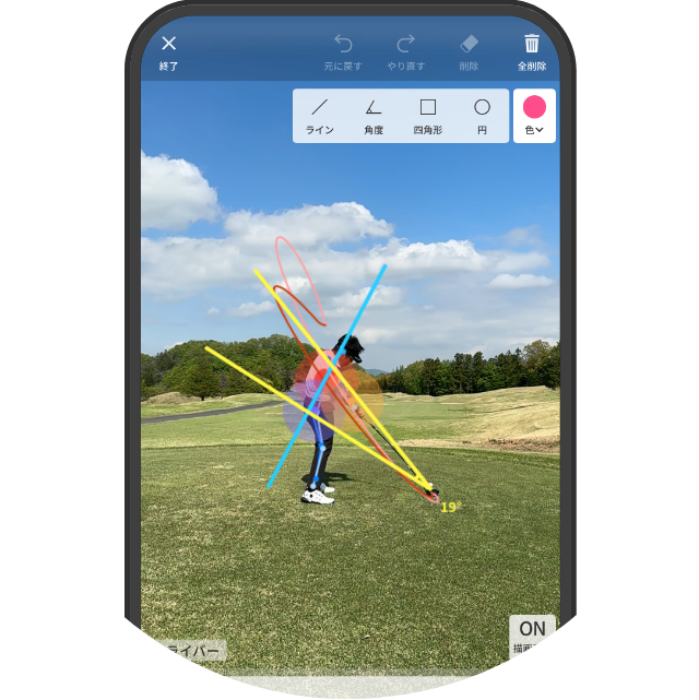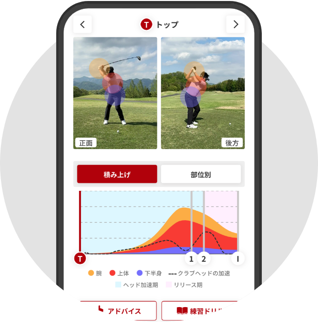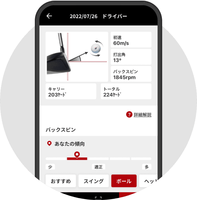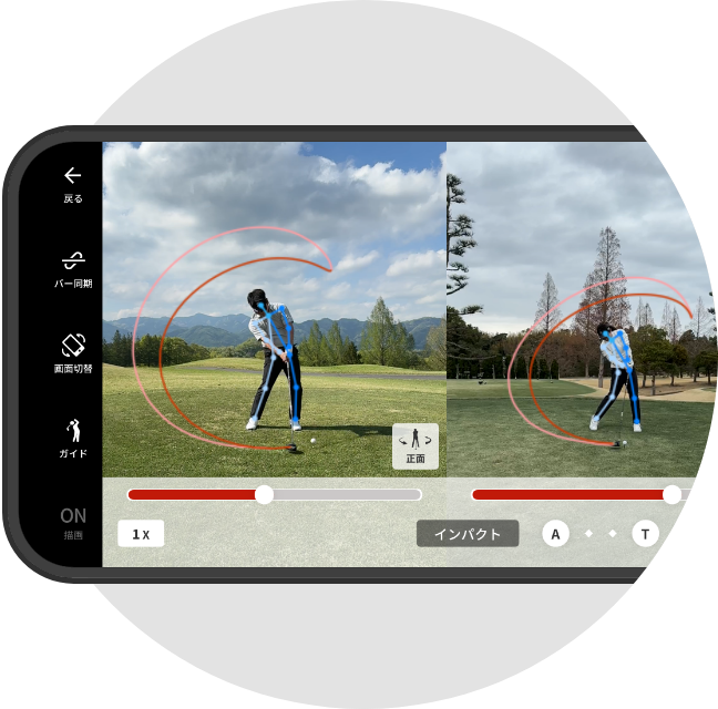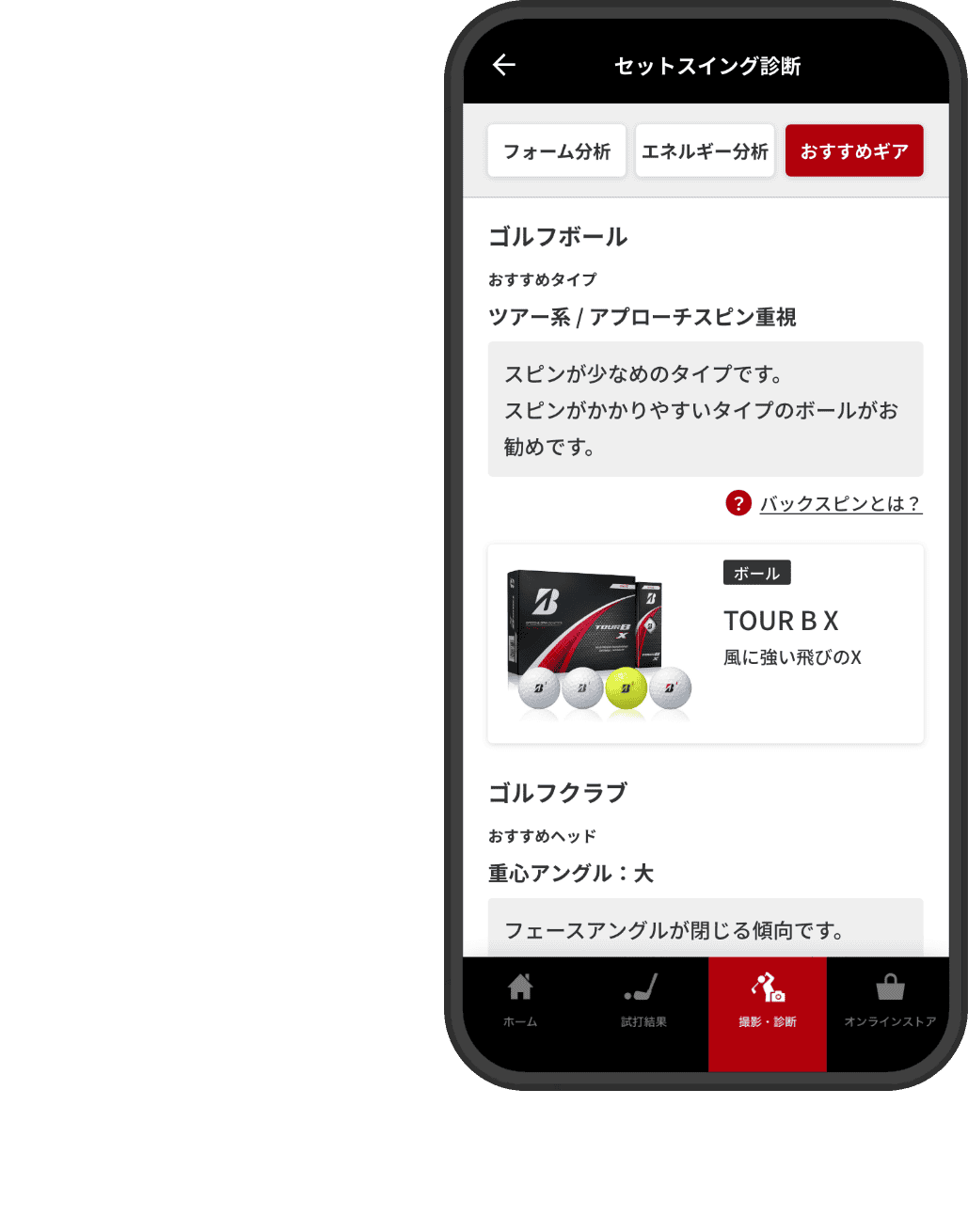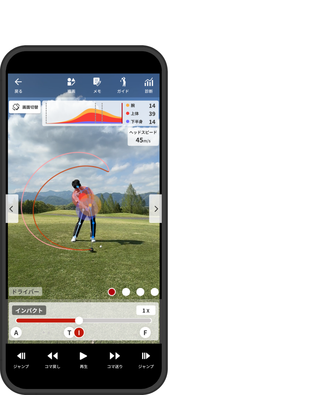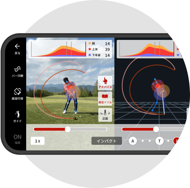 ①スマートフォンで撮影したスイング動画を解析し、診断・アドバイス・練習ドリル・おすすめギアをご確認いただけます